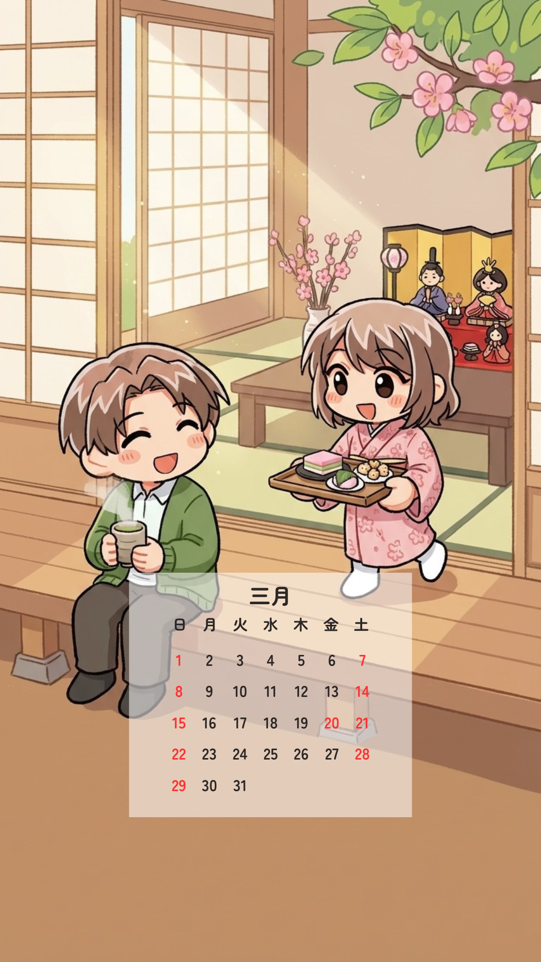 【スマートフォン・タブレット向け】 ダウンロードはこちらから 2026年3月用のカレンダーとして活用できます。イラストは毎月更新! サイズ:1080px×1920px